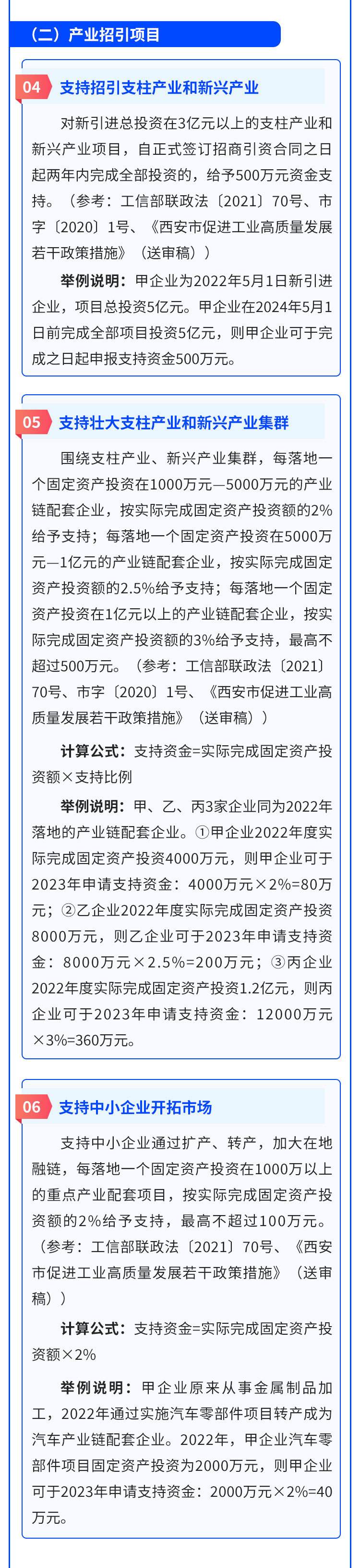围绕支柱产业、新兴产业集群,每落地一个固定资产投资在1000万元—5000万元的产业链配套企业,按实际完成固定资产投资额的2%给予支持;每落地一个固定资产投资在5000万元—1亿元的产业链配套企业,按实际完成固定资产投资额的2.5%给予支持;每落地一个固定资产投资在1亿元以上的产业链配套企业,按实际完成固定资产投资额的3%给予支持,最高不超过500万元。(参考:工信部联政法〔2021〕70号、市字〔2020〕1号、《西安市促进工业高质量发展若干政策措施》(送审稿))