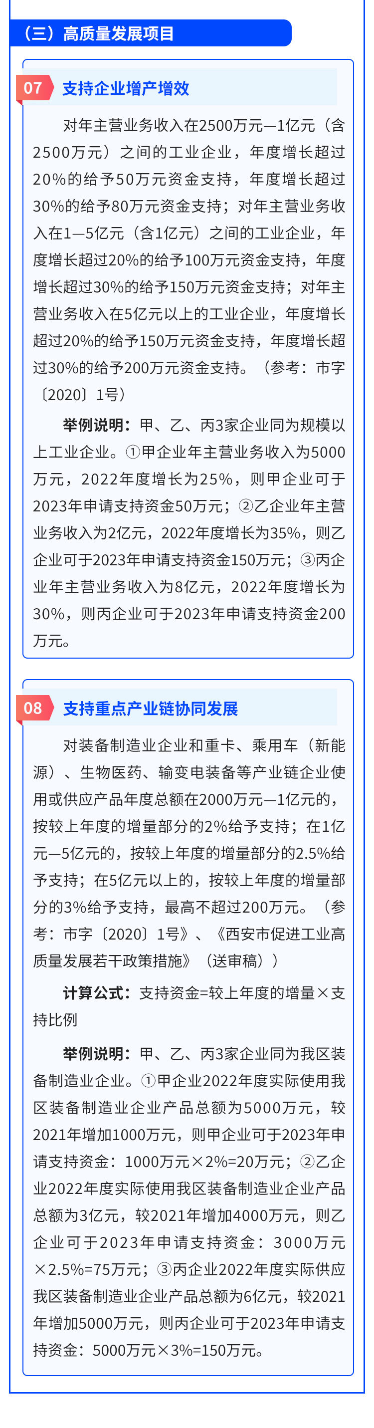 举例说明:甲、乙、丙3家企业同为我区装备制造业企业。①甲企业2022年度实际使用我区装备制造业企业产品总额为5000万元,较2021年增加1000万元,则甲企业可于2023年申请支持资金:1000万元×2%=20万元;②乙企业2022年度实际使用我区装备制造业企业产品总额为3亿元,较2021年增加4000万元,则乙企业可于2023年申请支持资金:3000万元×2.5%=75万元;③丙企业2022年度实际供应我区装备制造业企业产品总额为6亿元,较2021年增加5000万元,则丙企业可于2023年申请支持资金:5000万元×3%=150万元。