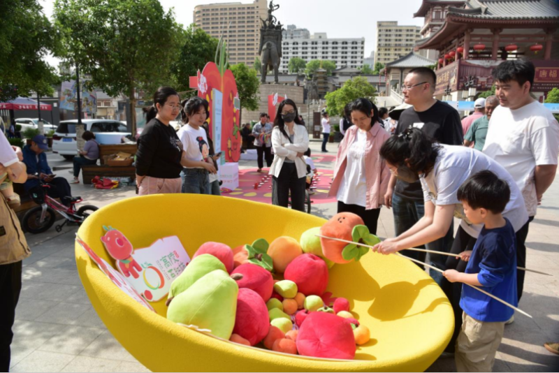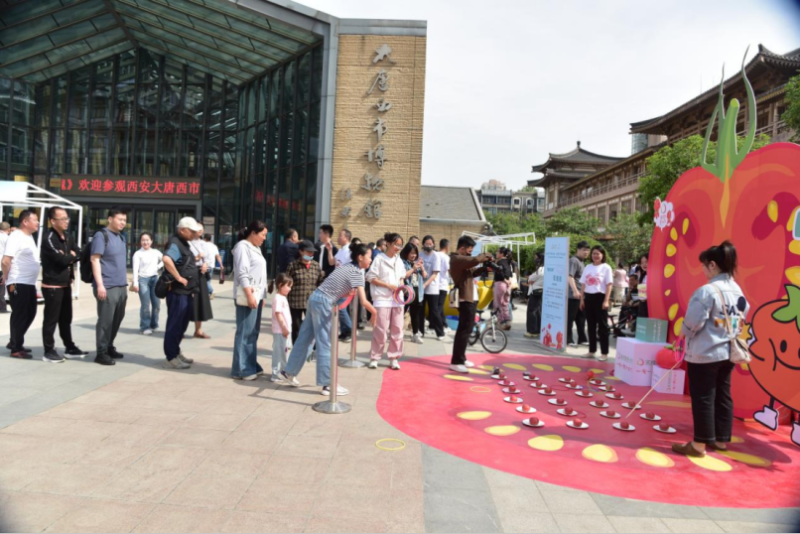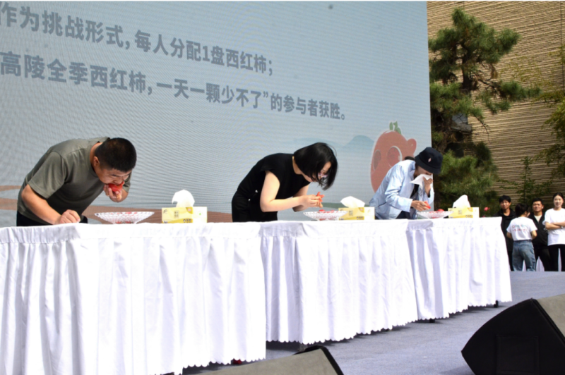 上午9时开始,气势恢宏的《遇见高陵》《高陵全季西红柿》宣传片拉开了活动帷幕,生动形象地展示了高陵的农业特色和品牌形象。作为本次活动的重头戏,现场邀请的种植户、企业及合作社代表对“高陵全季西红柿”及“南茂号” 酱菜、福瑞德番茄汁、高陵石头包子、高陵蔬菜鸡蛋等“土特产”进行了集中推介展示,还有以“高陵全季西红柿”为道具的“大快朵颐—西红柿大胃王”、“筷子夹圣女果”、“西红柿”套圈圈、超级大碗夹“果蔬”等趣味游戏,吸引了众多市民踊跃挑战,这些场景化、沉浸式、互动式的形式将现场气氛推向了高潮,也让更多的市民朋友记住和爱上“高陵全季西红柿”。