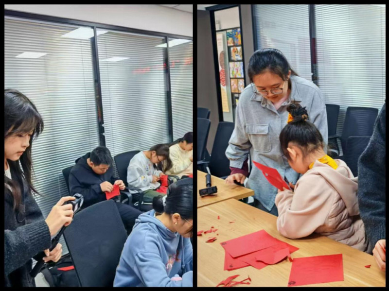 随后,胡老师手把手传授剪纸基础技法,从纸张折叠、图案勾勒到剪刀运裁,耐心指导在场的大学生与中小学生完成属于自己的生肖剪纸作品。红纸翻飞间,一个个造型灵动的生肖形象跃然纸上,孩子们的欢声笑语与剪刀的 “咔嚓” 声交织,构成了一幅生动的文化传承画卷。