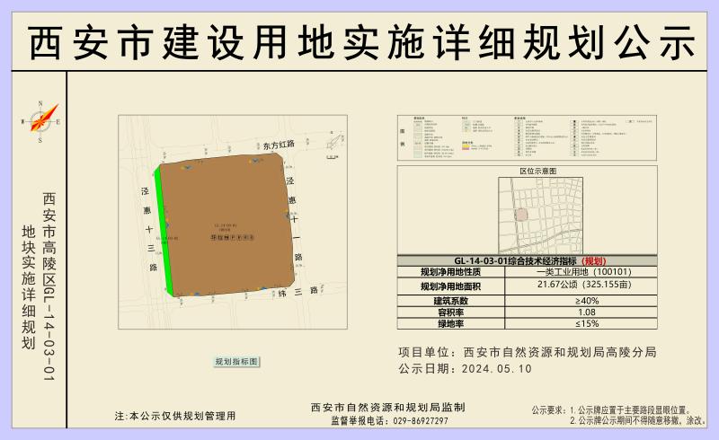 GL-14-03-01地块用地性质为一类工业用地(100101);净用地面积约325.155亩,容积率1.08,建筑系数≥40%,绿地率≤15%。配套设施:公共厕所建筑面积360㎡,环网柜用地面积126㎡,垃圾收集点占地120㎡。停车位配建标准符合《西安市建设项目停车位配建标准》(市资源发〔2023〕3号)要求。