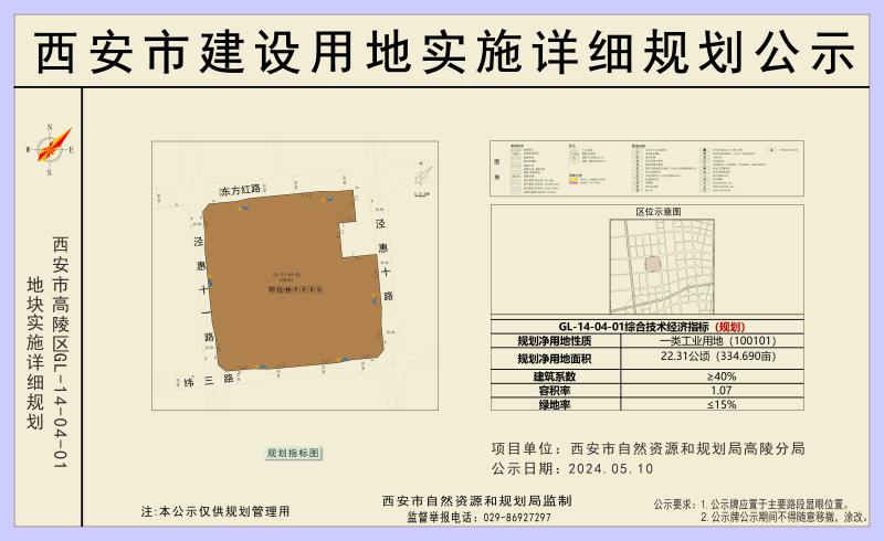 GL-14-04-01地块用地性质为一类工业用地(100101);净用地面积约334.690亩,容积率1.07,建筑系数≥40%,绿地率≤15%。配套设施:公共厕所建筑面积60㎡,环网柜用地面积126㎡,垃圾收集点占地120㎡。停车位配建标准符合《西安市建设项目停车位配建标准》(市资源发〔2023〕3号)要求。