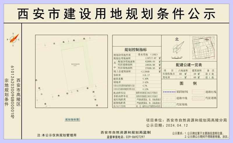 该宗地位于高陵区泾高南路以南、渭阳五路以北、环高东路以西、西韩公路以东。净用地面积约123.000亩。用地性质为排水用地(1302),容积率≤0.17,建筑系数≤40.0%,绿地率≥45.0%。地上建筑面积≤13940㎡,行政办公和生活服务占地面积不超过净用地面积的7%,建筑面积不超过地上总建筑面积的15%。机动车停车位、非机动车停车位按市资源发〔2023〕3号执行,人防面积以人防部门审批为准。