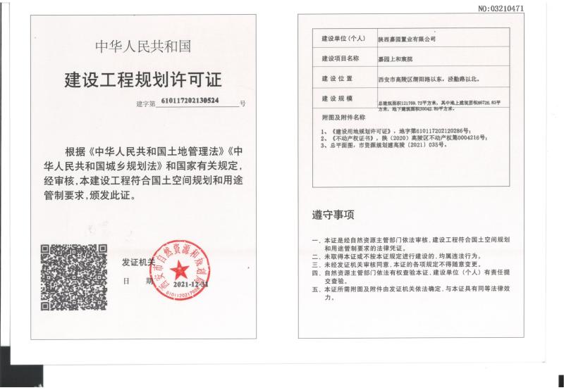 陕西嘉园置业有限公司嘉园上和宸院《建设工程规划许可证》(建字第610117202130524号)于2021年12月31日核发。现因规划变更,自2025年1月16日起,建字第610117202130524号《建设工程规划许可证》及其附图市资源规划建高陵〔2021〕035号总平面图作废。