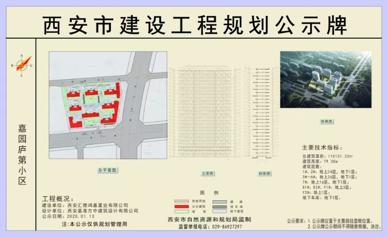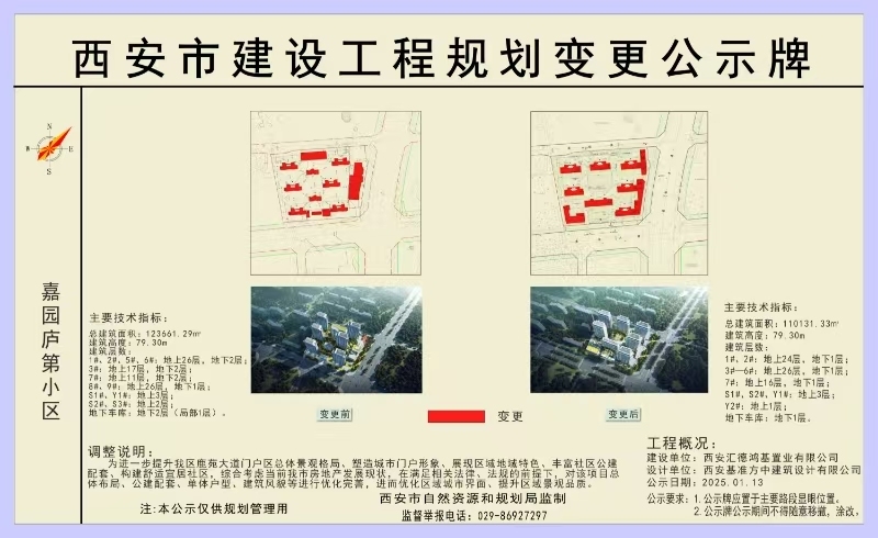 西安汇德鸿基置业有限公司嘉园庐第小区《建设工程规划许可证》(建字第610117202130519号)于2021年12月30日核发;现因规划变更,予以进行为期7个工作日的公示,待相关利害关系人无异议后我局将按程序核发该项目变更后的《建设工程规划许可证》。