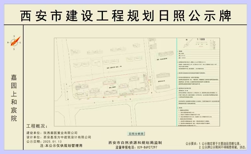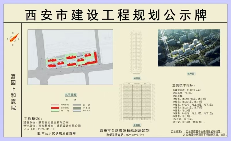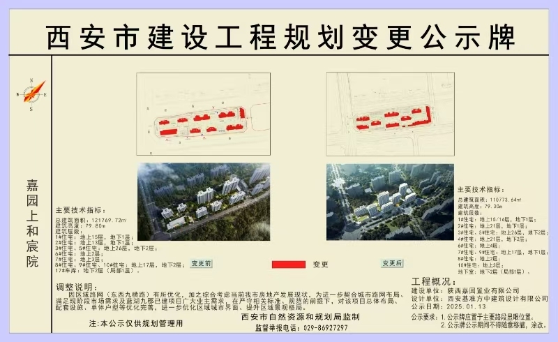 陕西嘉园置业有限公司嘉园上和宸院《建设工程规划许可证》(建字第610117202130524号)于2021年12月31日核发;现因规划变更,予以进行为期7个工作日的公示,待相关利害关系人无异议后我局将按程序核发该项目变更后的《建设工程规划许可证》。