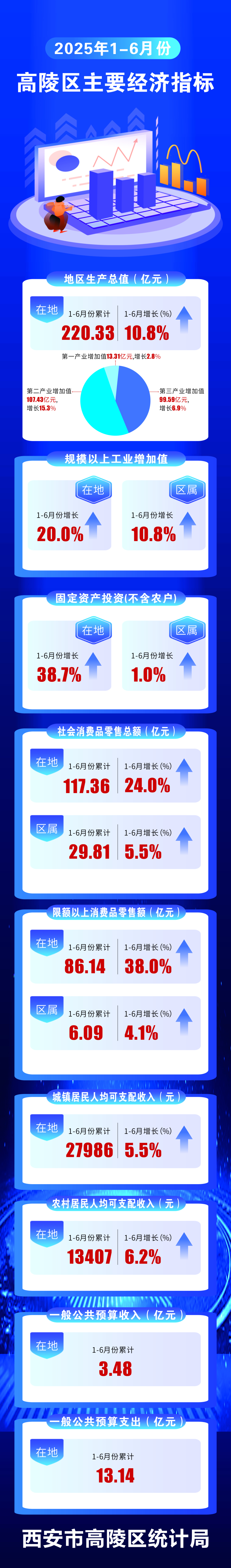 2025年1 - 6月高陵区公布主要经济指标,涵盖地区生产总值、各产业增加值、规模以上工业增加值、固定资产投资、社会消费品零售总额等多项数据及增长情况,还包括城乡居民人均可支配收入、一般公共预算收支等内容。 |