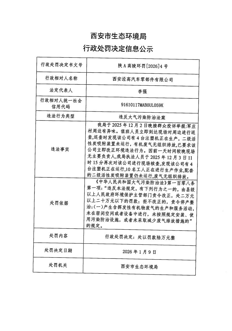 西安市生态环境局行政处罚决定信息公示陕A高陵环罚〔2026〕4号