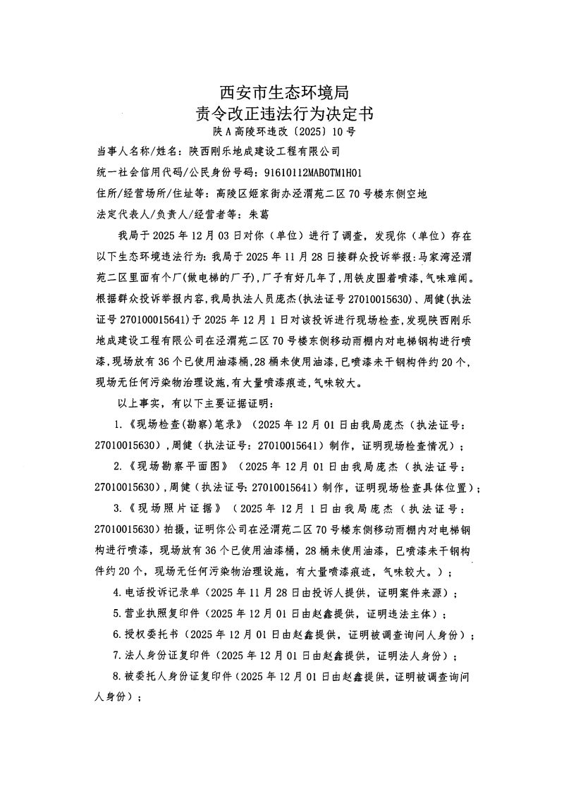 西安市生态环境局责令改正违法行为决定书陕A高陵环违改〔2025〕10号