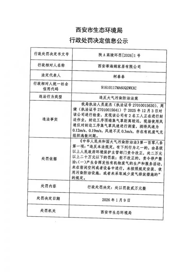 西安市生态环境局行政处罚决定信息公示陕A高陵环罚〔2026〕1号