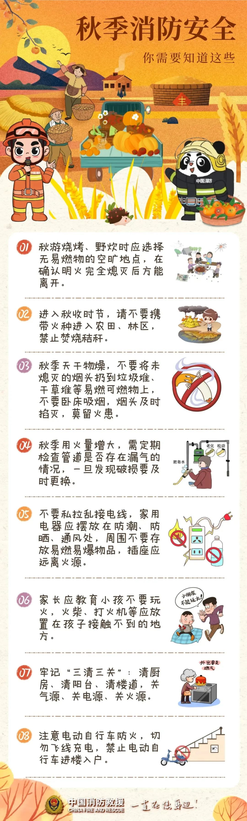 进入秋季火灾隐患增加,提供了秋季防火小知识,但未详细说明内容。