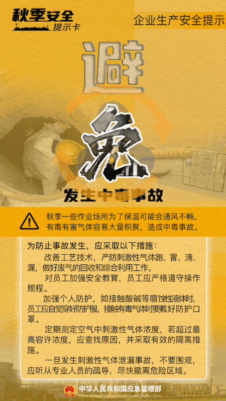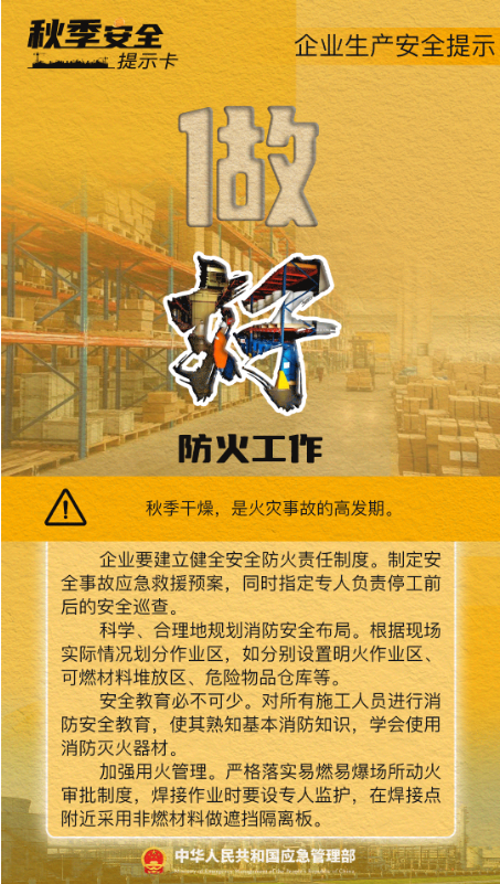 秋季昼夜温差大,冷暖变化不规律,这些看似寻常的气候变化往往会影响企业的安全生产工作,一些事故发生概率也会因为季节性因素而升高。俗话说“春困秋乏”,莫让安全意识“打了盹”,这份企业秋季安全生产提示卡请收好。