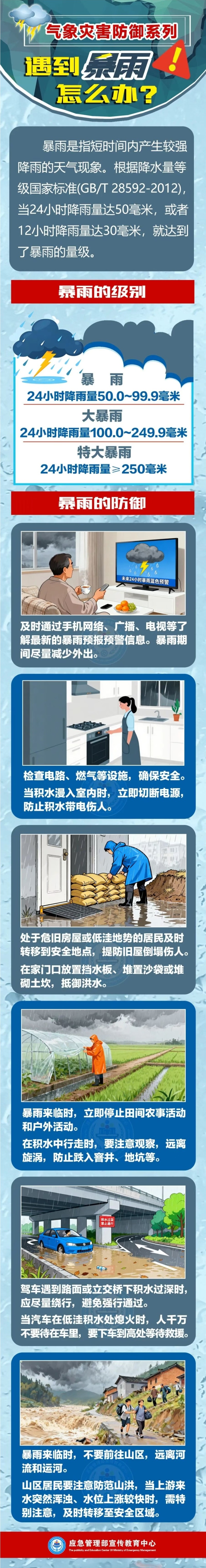 遇到暴雨怎么办?需要做好哪些防范应对措施?这份防御指南请收好。来源:应急管理部宣传教育中心