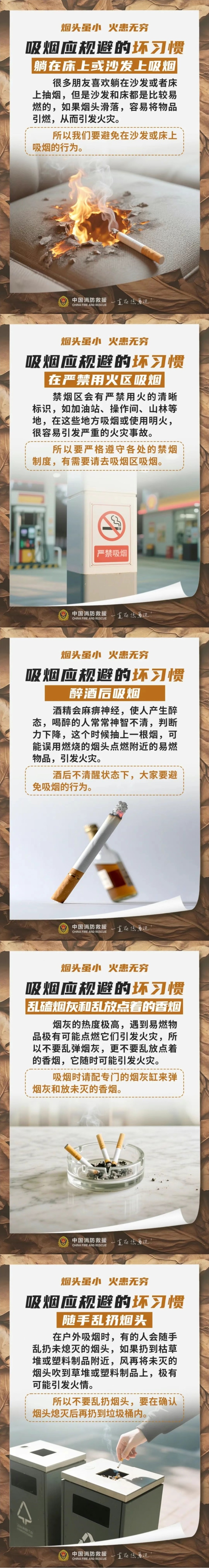 对于不少“烟民”朋友来说,抽完烟后的“标准动作”都是“随手一弹”。但你知道吗?一根吸剩的烟头若未及时熄灭仍可持续燃烧1-4分钟,一旦随意丢弃,足以引起一场火灾。为了您和他人的生命财产安全,这些不好的吸烟习惯一定要规避。