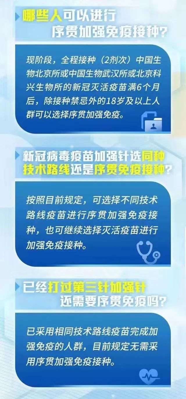 专家介绍,序贯加强免疫接种的前提是:18岁以上的人群,已完成2剂次新冠病毒灭活疫苗(国药中生北京公司、北京科兴公司、国药中生武汉公司)接种,且第二针打完已满6个月,没有打第三针。对于满足新冠病毒疫苗加强免疫接种条件的群众来说,到底接种序贯加强免疫还是接种同源加强免疫,具体可根据辖区疫苗供应情况和自身需求,选择其中一种就可以。