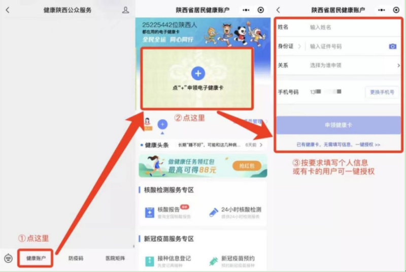 点击底部菜单栏“健康账户”→“点+申领电子健康卡”→按要求填写个人信息/有卡用户可一键授权→成功申领电子健康卡
