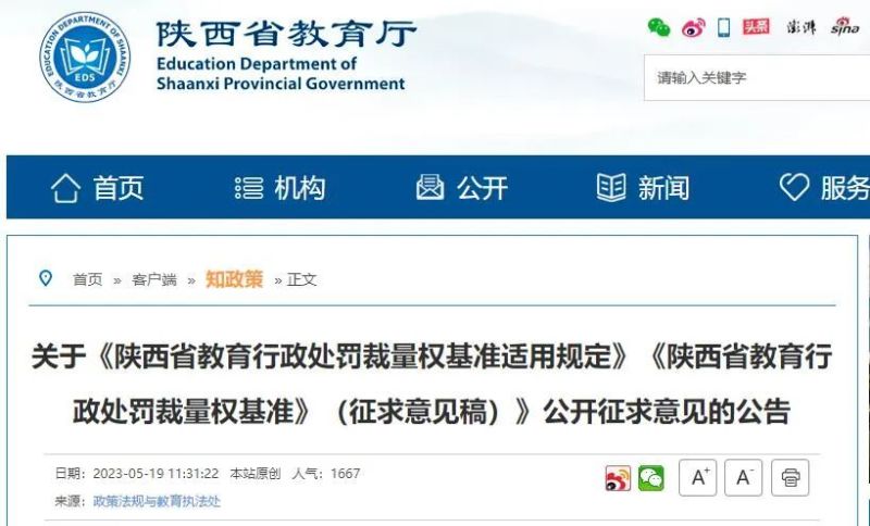 5月19日,陕西省教育厅印发《陕西省教育行政处罚裁量权基准适用规定(征求意见稿)》。