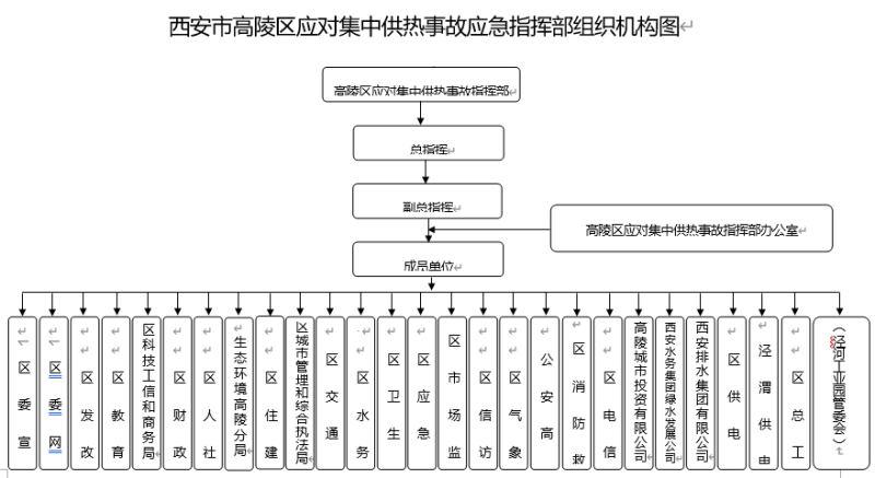 成立西安市高陵区集中供热事故应急指挥部(以下简称区应对集中供热事故指挥部),负责统一领导和组织实施集中供热事故的应急处置工作。