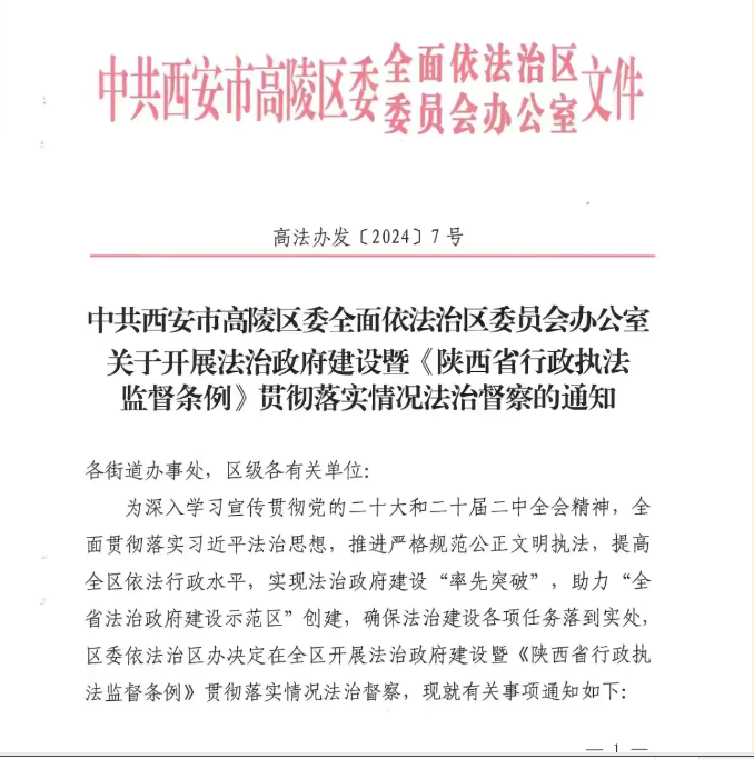 法治建设是推进国家治理体系和治理能力现代化的重要路径。今年以来,高陵区深入贯彻党的二十大精神,全面践行习近平法治思想,以创建“全省法治政府建设示范区”为契机,坚持“四项举措”,纵深开展法治政府建设暨《陕西省行政执法监督条例》贯彻落实情况法治督察,进一步推进严格规范公正文明执法,助推法治政府建设“率先突破”,有效提升法治政府建设水平。